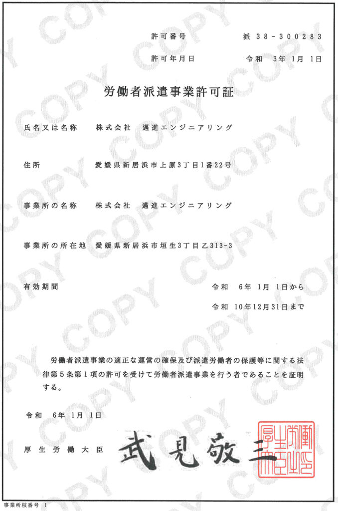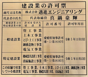 建設業許可/般-1 第18195号(とび・土木工事業、銅構造物工事業) 建設業許可/般-30 第18195号(管工事業) 建設業許可/般-2 第18195号(電気工事業) 建設業許可/般 第18195号(機械器具設置工事業)